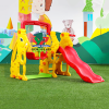 - Bộ cầu trượt gồm có máng trượt đôi kết nối với nhà chòi. Bên hông có hầm chui hình chữ U được thiết kế hài hòa phía dưới sàn nhà chòi.