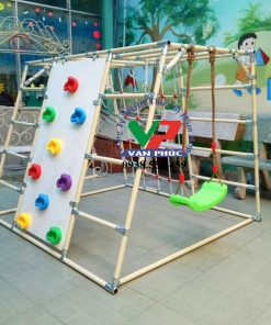 - Thiết kế đa năng: Tích hợp nhiều chức năng như xà đu, cầu trượt, leo trèo, giúp trẻ thỏa sức vui chơi. Độ cao và kích thước được thiết kế phù hợp với trẻ mầm non, tạo điều kiện để trẻ vừa vui chơi, vừa rèn luyện thể lực.