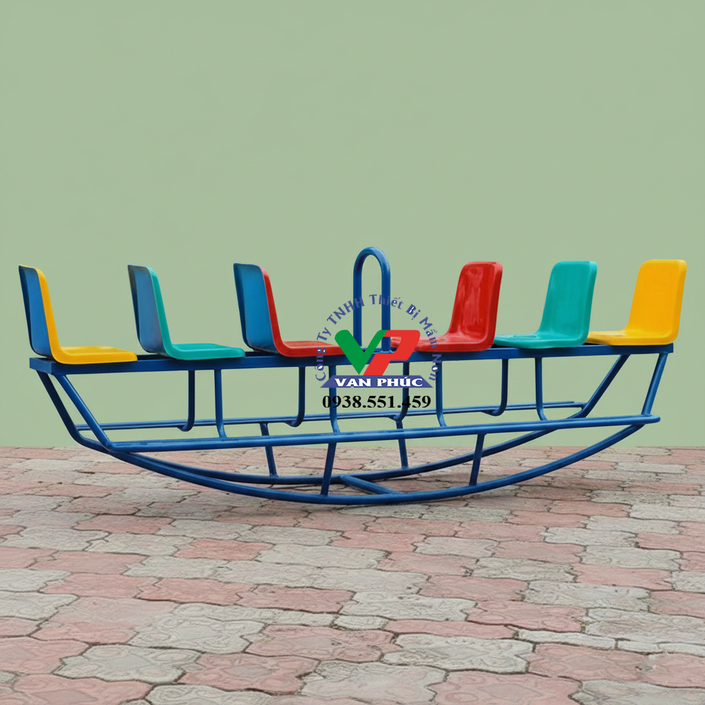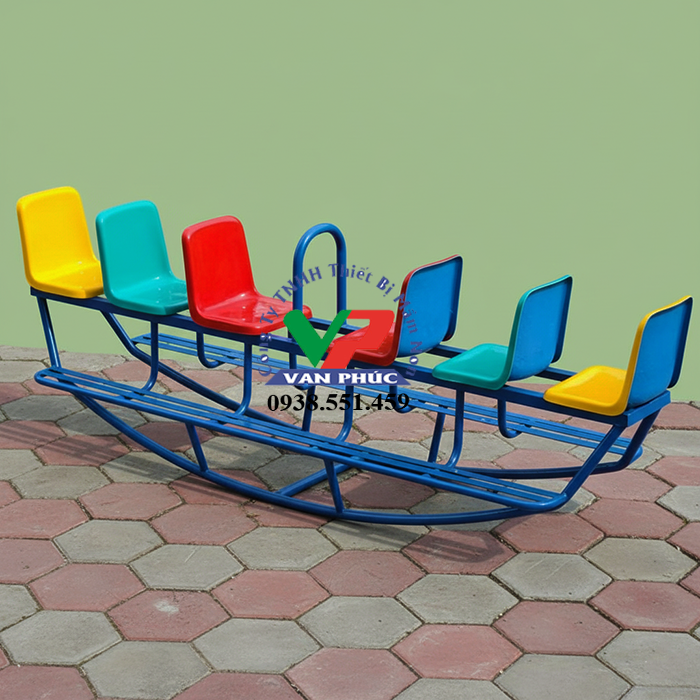 - Thiết kế và Kích thước: Bập bênh được thiết kế như một chiếc long thuyền, với tổng cộng 6 ghế ngồi được sắp xếp hàng ngang. Mỗi ghế ngồi có đủ chỗ cho một hoặc hai trẻ em, tùy thuộc vào kích thước và trọng lượng của trẻ.