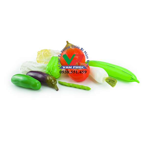 - Loại thực phẩm: Bộ đồ chơi dinh dưỡng 2 bằng nhựa cho trẻ mầm non gồm 10 loại thực phẩm, bao gồm cải trắng, cà chua, dưa chuột, củ cải trắng, đậu quả, su su, bắp cải thảo, cà tím dài, quả gấc và quả mướp. Mỗi loại thực phẩm thường được thiết kế với màu sắc và hình dáng tương tự thật.