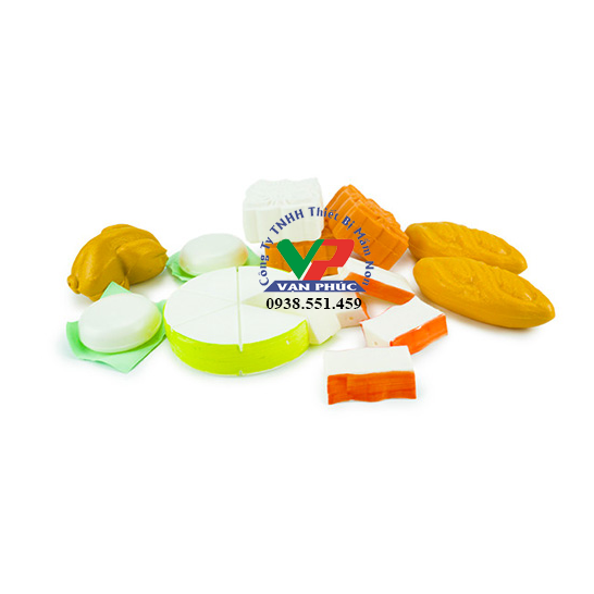 - Loại thực phẩm: Bộ đồ chơi này bao gồm 6 loại thực phẩm giả tạo, bao gồm bánh mỳ, bánh dày, bánh dẻo, bánh nướng, gà quay, giò lụa, và chả quế. Mỗi loại thực phẩm thường được thiết kế với màu sắc và hình dáng tương tự như thật.
