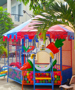 • Chất liệu: Mái simili Đài Loan, khung ống O27 dày 1.5 ly, sàn dày 1.5 li, xung quanh giăng lưới thép B40, cầu thang ra vào, máng trượt composite.