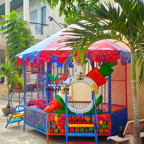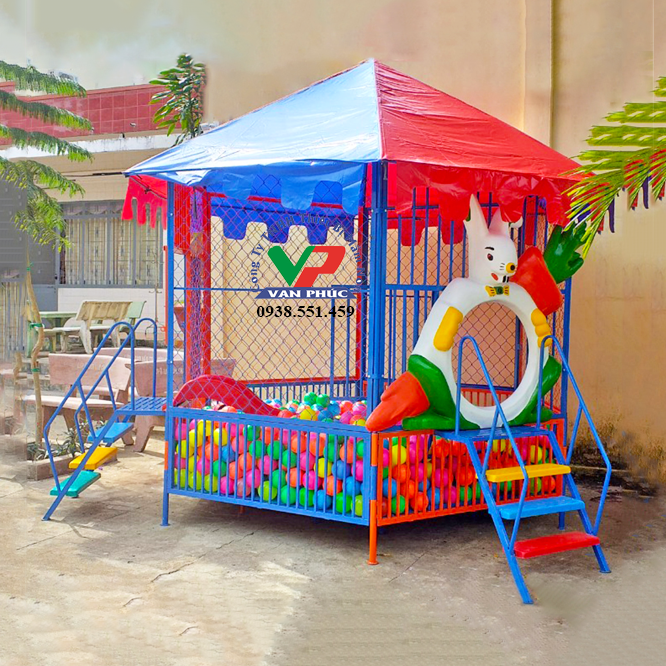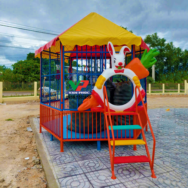 • Chất liệu: Mái simili Đài Loan, khung ống O27 dày 1.5 ly, sàn dày 1.5 li, xung quanh giăng lưới thép B40, cầu thang ra vào, máng trượt composite.