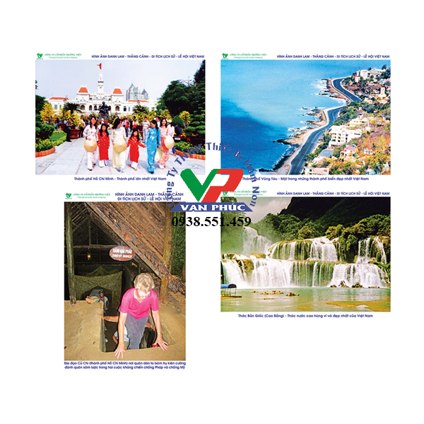 - Chi tiết: 20 ảnh, giới thiệu một số lễ hội, danh lam, thắng cảnh trên đất nước Việt Nam. In 4 màu, giấy couché 200g/m2. KT: 310 x 420(mm). Sản phẩm phủ PVE.